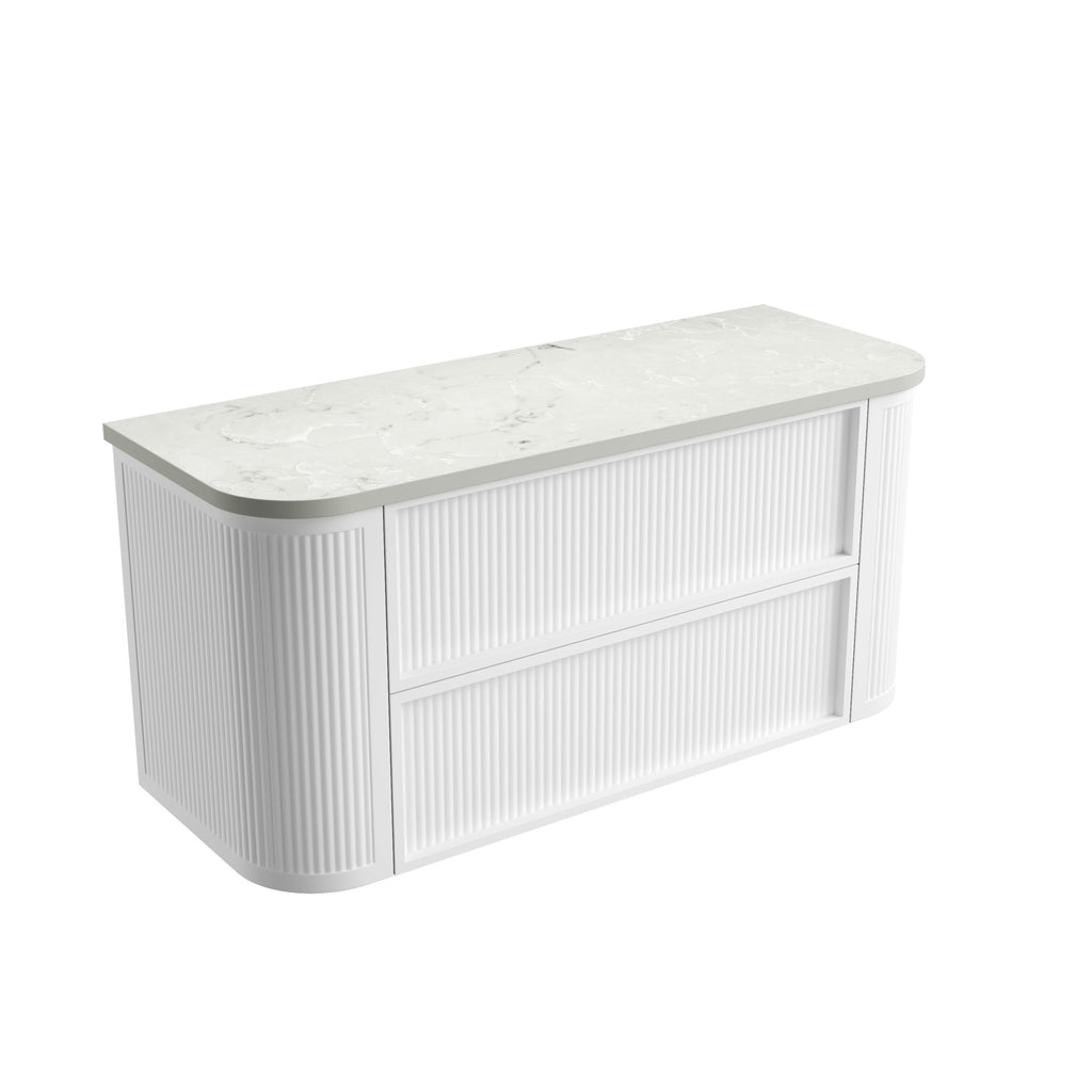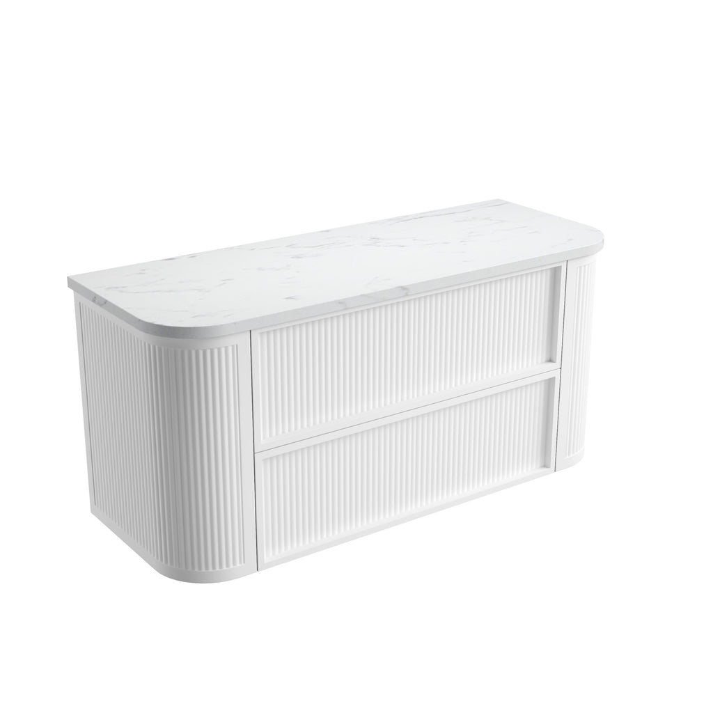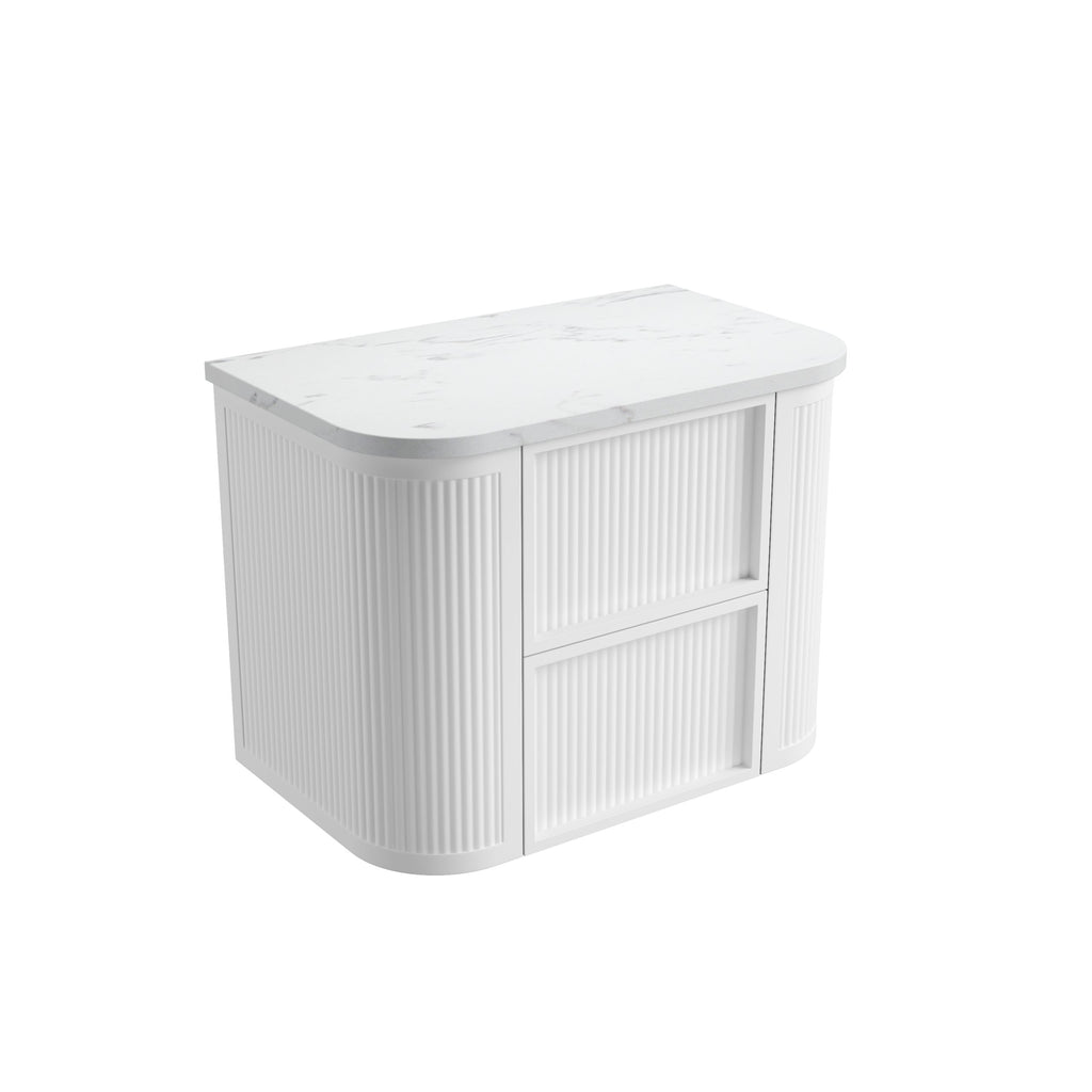 - Designed for maximum functionality and modern style, this all-drawers vanity features elegant curved ends and a sleek minimalist L-rail finger pull design. Crafted from premium-grade, durable timber plywood, it’s finished in a versatile V-groove polyurethane matte white for a clean, contemporary look. The stacked drawers offer generous storage space and are equipped with Hettich Quadro S full-extension, soft-close runners for smooth, silent operation. Premium graphite interiors and included drawer organisers add a sophisticated touch—perfect for those who value order, durability, and modern design.