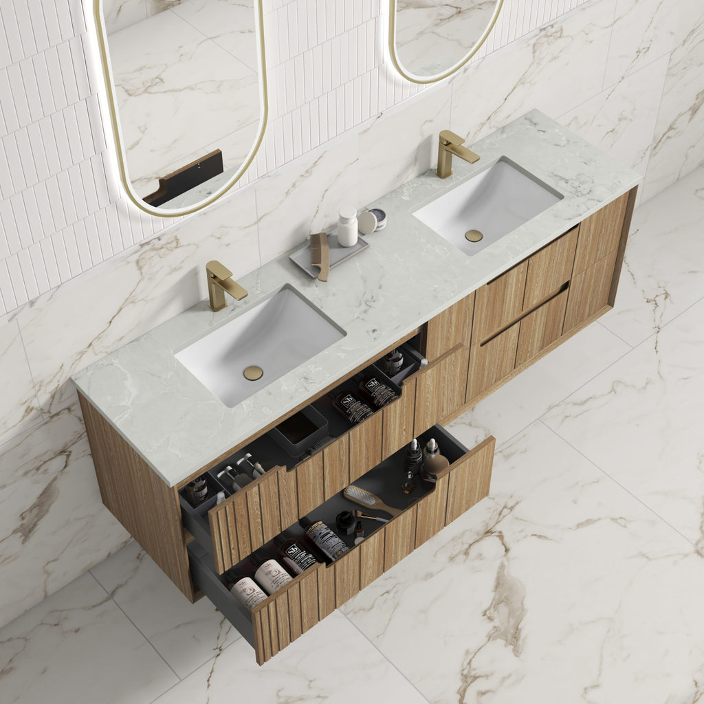- This all-drawers vanity brings refined simplicity and natural warmth to any space. Crafted from premium-grade, durable timber plywood, it features a contemporary minimal groove design that highlights the natural timber grain beneath a hard-wearing laminate finish. The bevel edge detailing adds a modern touch, while Hettich Quadro S full-extension, soft-close runners ensure smooth, effortless access. Inside, premium graphite interiors and included drawer organisers offer smart, stylish storage—perfect for those who appreciate clean lines and everyday luxury.